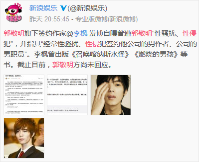 8月21日20时,男性作家李枫发长微博《关于郭敬明。致所有人》称自己遭到郭敬明性骚扰和性侵犯,郭敬明还经常性骚扰、性侵犯签约到他公司的男作者、公司的男性职员。随后,李枫还发文表示:“我在最世出版过的所有书,大家都不要买,不要让钱流进郭敬明的口袋,社会各界的朋友们也都不要再与郭敬明合作,所有的人都应该一起抵制他,我们绝对不要纵容犯罪。”微博发出后,迅速引起舆论关注。事发一小时后,郭敬明发微博:1.完全捏造。2.已让律师处理。