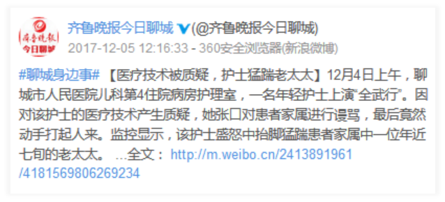 12月5日,@齐鲁晚报今日聊城 发布了一个视频及文章《聊城市医院:医疗技术被质疑,护士猛踹老太太!》,一时激起千层浪。视频显示,12月4日上午,聊城市人民医院儿科第4住院病房护理室,护士抬脚猛踹患者家属中一位年近七旬的老太太。视频同时显示,家属推搡之际,另一护士在安抚患儿。