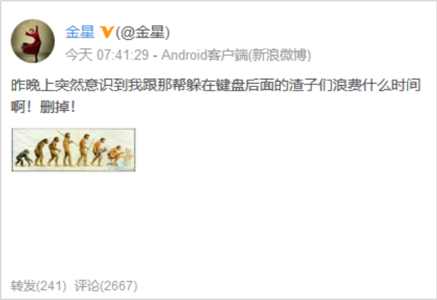 目前,@金星 已将这条微博删除,并发布微博“昨晚上突然意识到我跟那帮躲在键盘后面的渣子们浪费什么时间啊!删掉!”