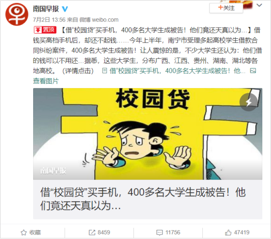 @南国早报 最早发布了相关新闻,【借“校园贷”买手机,400多名大学生被告!他们竟还天真以为...】截至7月4日11:00该条博文转评:8459/11756。