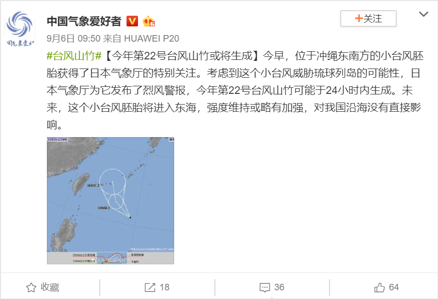 7日15:56,@中国气象爱好者 再度发文“今年最重要的台风即将生成”,并强调“22号台风‘山竹’的环流大小要远远超过飞燕。它会非常靠近我国,不排除登陆可能。这是今年最强、最大、影响最厉害台风的有力竞争者,值得密切关注”,该博文获得转/评:994/289,网友留言“还是希望不要登陆,今年韭菜已经很惨了”“我居然在两个台风的夹缝间完成了日本行程”。