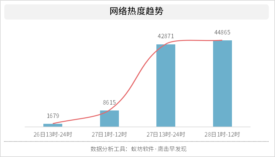 据舆情监测系统鹰击早发现显示,上海Costco开业前半天至暂停营业期间,与线下的火爆场面相比网络热度仅小幅增长;27日中午到28日凌晨上升到此前的4倍之多,直至28日仍在持续发酵。可见,上海Costco开业前并无刻意舆论造势,一波抢购热潮将其带到了网络舆论场。