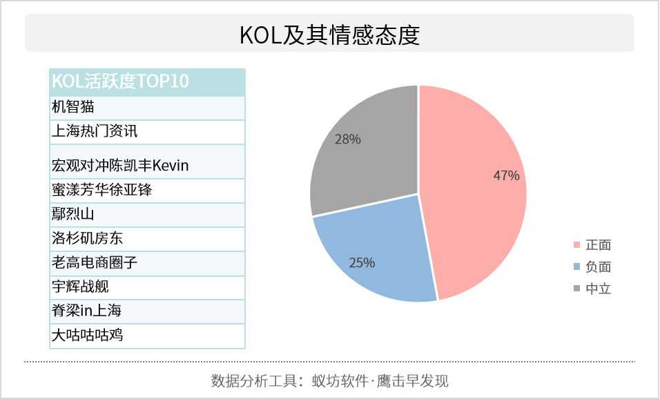 由鹰击早发现数据分析可知,@机智猫 @上海热门资讯 @洛杉矶房东 等具有高活跃度和影响力的关键意见领袖在上海Costco相关信息的传播中发挥最重要作用,总体来看,接近一半的KOL持正面情感倾向。