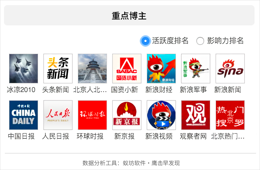 新浪微博:@蚁坊软件 @蚁工厂 @鹰眼舆情观察室 @鹰眼口碑研究室