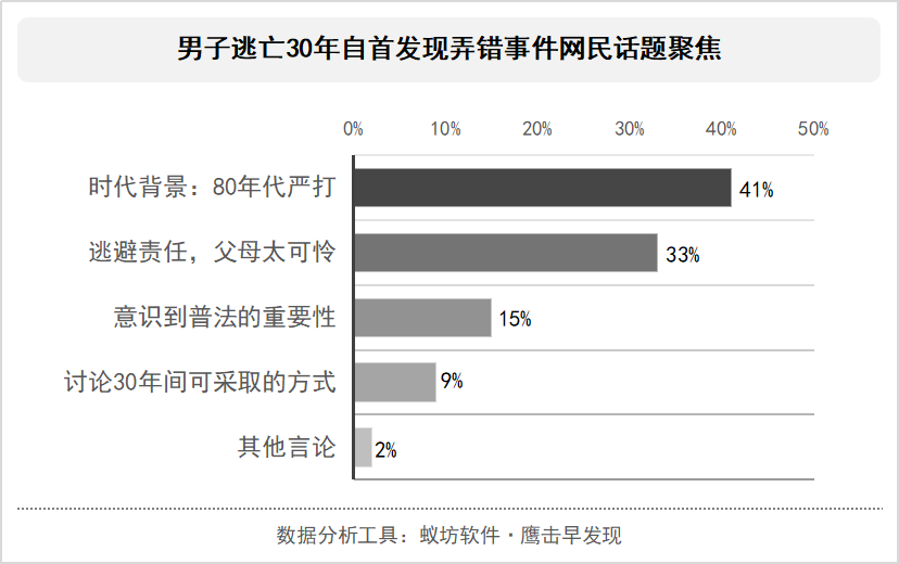 经过媒体传播和网络意见领袖的舆论动员,民间舆论场针对男子逃亡30年自首发现弄错事件的看法既有相同点,同时也更加多元化。首先,80年代严打的时代背景被认为是男子悲剧产生的根源,“30年前打架本来就可能被枪毙”,该话题占比41%;其次,网民更多的是谴责该男子逃避责任的行为,与父母失联30年直至双亲去世都未能尽孝;再次,不少网民由此意识到普法的重要性;还有网民讨论30年间男子可以采取各种方法确认是否被追逃。另外还有如“以后踏踏实实生活”“口音都变了”等其他言论。