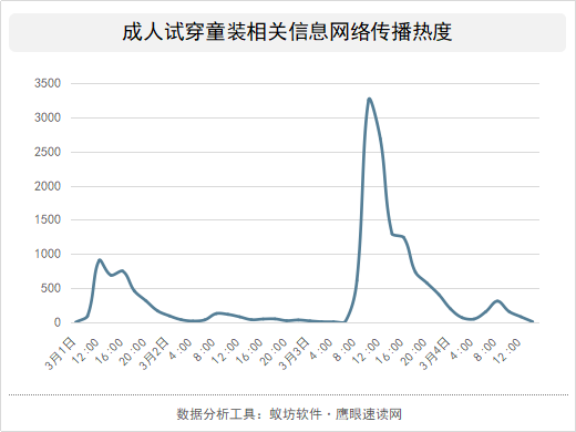3月1日,博主@直男什么值得买 发布了一则“成人试穿优衣库童装,优衣库童装已经禁止成人试穿了”的博文,并配以成年人试穿优衣库童装的各种自拍照。该条博文发出后开始在网络空间内引发关注,引发了网民以及其他自媒体大V 纷纷发表观点,使相关消息在3月1日下午形成了一个小峰值,随即呈现不断下降的趋势,且在未来的一天内并没有形成舆情波澜。这一期间的传播主体主要为一些民间的自媒体博主,总体来看其传播影响力有限。