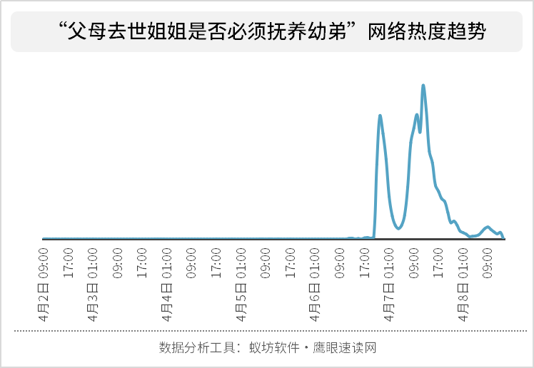 从舆情监测软件鹰眼速读网的分析来看,话题“父母去世姐姐是否必须抚养幼弟”于电影上映之日起便已经在社交网络传播,但是影响范围有限。直到6日12:05@沸点视频 带话题#父母去世姐姐是否必须抚养幼弟#发布博文【#律师解读父母去世姐姐抚养幼弟#:按照监护顺序 抚养弟弟是法定义务】之后,引发网友关注,当天晚上19时舆情热度直线上升,22时达到第一波峰值,此时舆论围绕“养不养”发表个人观点。