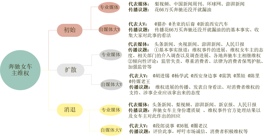 热点维权事件中专业媒体和自媒体大V的传播基本呈现一致的状态,实现了传播共振,其传播共振的具体表现主要分为三个方面。第一,从舆情发展的各个时期来看,两大媒体类型的关注度和传播频率具有一致性。例如在舆情初始期和消退期两大媒体类型的关注度相对较低,在舆情扩散期两大媒体类型的关注度则普遍较高;第二,从消息扩散来看,专业性媒体主要倾向于基本事实的传播,而自媒体大V对基本消息的扩散也发挥了不容小觑的作用。例如,在专业性媒体积极报道维权事件的每一步进展时,自媒体大V也是第一时间跟进传播,积极扩大事件进展的传播范围;第三,从倾向性观点输出方面来看,专业性媒体的评论性报道和自媒体大V的意见表达也呈现出某种一致性。例如,在奔驰女车主维权事件中,一些专业媒体发表了尊重消费者、保护消费者权益的评论性观点,而自媒体大V在发表看法过程中,也表现出对支持消费者维权的积极态度。
