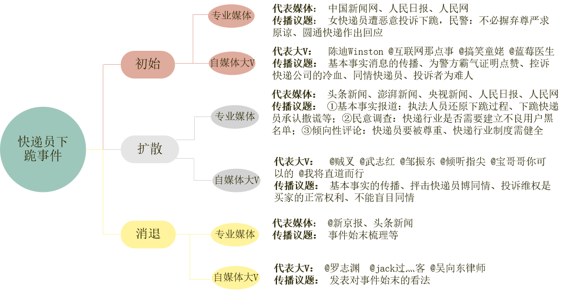 综观热点维权事件网络舆情的演化过程,不难发现财经性媒体和相关领域内自媒体大V对维权事件的传播表现出较高的活跃度。从财经性媒体来看,根据蚁坊软件舆情监测系统显示,在对这些事件进行传播且影响力较高的媒体中,财经网、凤凰网财经、每日经济新闻、央视财经、中国经济网等财经性媒体都榜上有名,并且这些财经性媒体一直活跃在舆情演化的各个时期,这些财经性媒体主要是立足于对事件进程的关注和报道;从相关领域内自媒体大V来看,法律相关的大V博主、财经大V博主、电商大V博主等都对相关事件的关注表现出一定的活跃性,这些大V的传播焦点更多的是集中在发表对事件的主观看法上。例如,在关于汽车领域奥迪致癌事件和奔驰女车主维权事件中,汽车类大V博主传播活跃度更高、在快递领域快递员下跪事件和快递二次收费事件中,物流类、电商类和快递类大V博主的传播活跃度更高。由于他们都是相关领域内专业性的自媒体大V,因此其对于事件网络舆情的演化具有一定的影响力。