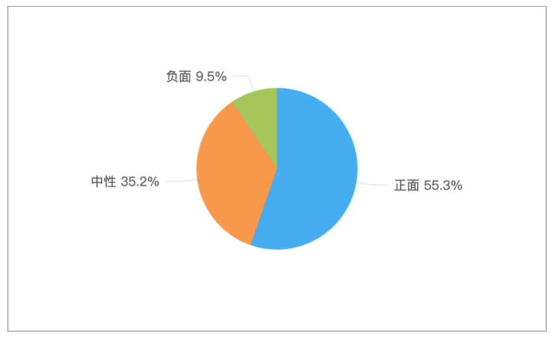 该时段内,有关“2026年全国两会”的舆情情感倾向中,正面舆情占比最多,达55.3%;中性舆情次之,占比35.2%;负面舆情较少,占9.5%。