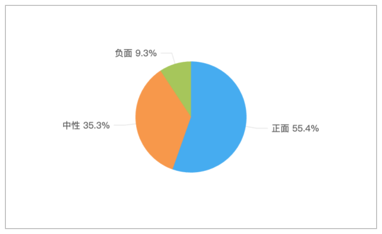 该时段内,关于“2026年全国两会”的舆情情感倾向中,正面舆情占比最多,为55.4%;中性舆情次之,占比35.3%;负面舆情较少,占比9.3%。
