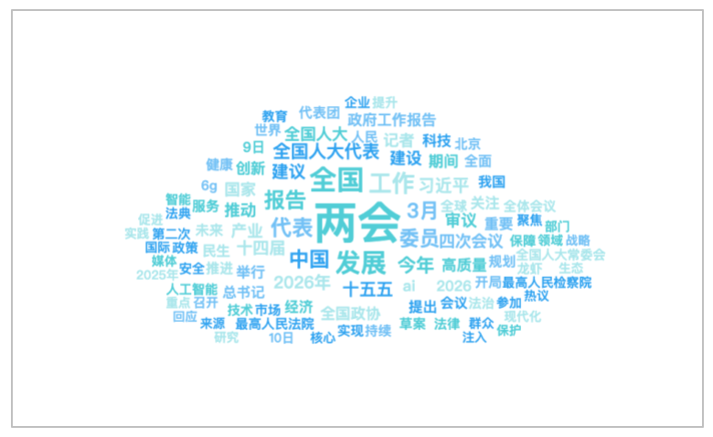该时段内,有关“2026年全国两会”的话题提及频次较高的词语有“两会”、“全国”、“发展”、“工作”、“代表”等。
