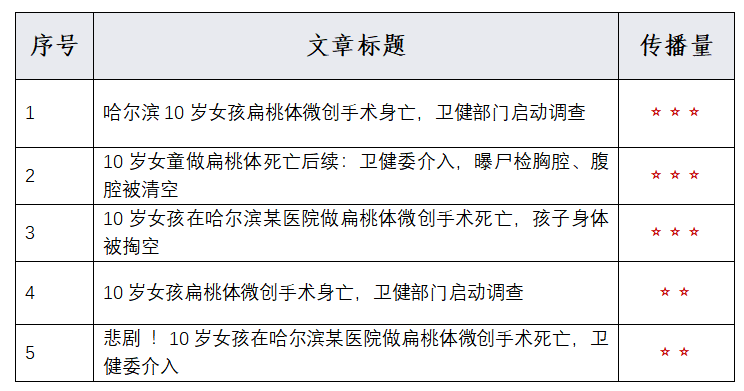 由上图可以看出,有关“哈尔滨10岁女孩扁桃体微创手术死亡”的话题提及频次较高的词语有“手术”、“扁桃体”、“10岁”、“微创”、“女孩”等。