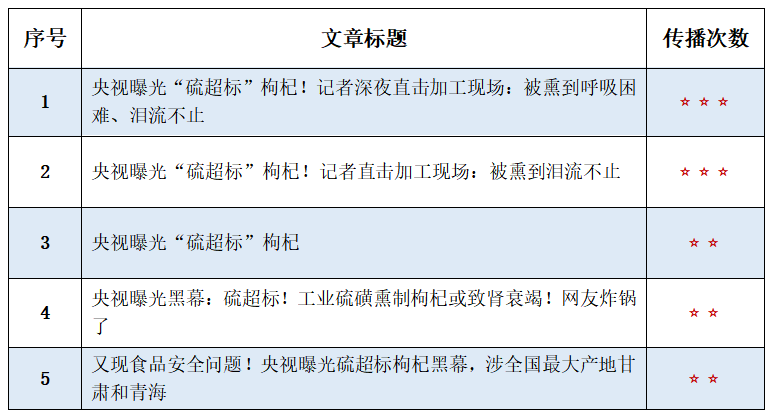 由上图趋势可以看出,全网有关“央视曝光工业硫磺熏制枸杞加工黑幕”的舆情最高峰出现在09月02日14时。