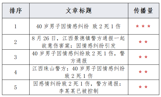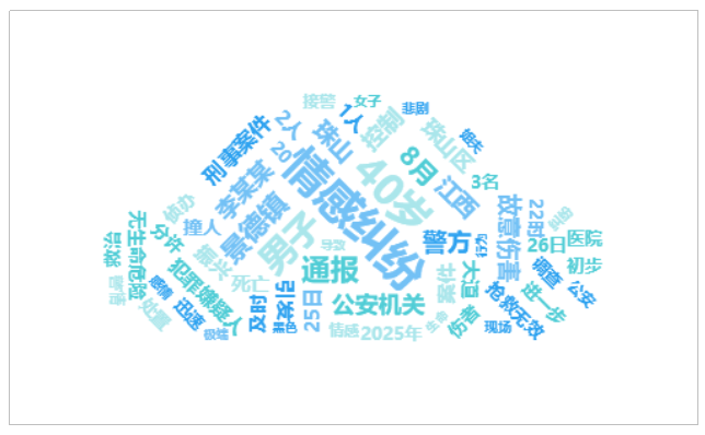 由上图可以看出,有关“景德镇40岁男子因情感纠纷致2死1伤”的话题提及频次较高的词语有“情感纠纷”、“40岁”、“男子”、“通报”、“景德镇”等。