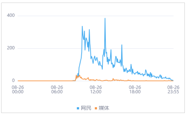 由上图趋势可以看出,有关“景德镇40岁男子因情感纠纷致2死1伤”的媒体舆情于08月26日09时00分达到最高峰,网民舆情于08月26日13时25分达到最高峰。