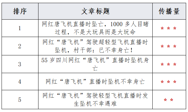 由上图可以看出,有关“四川网红唐飞机直播时坠机死亡”的舆情情感倾向,中性舆情占比最多,为53.2%;其次是负面舆情,占比29.2%;正面舆情占比最少,为17.6%。