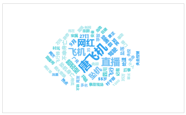 由上图可以看出,有关“四川网红唐飞机直播时坠机死亡”的话题提及频次较高的词语有“唐飞机”、“直播”、“飞机”、“网红”、“坠机”等。