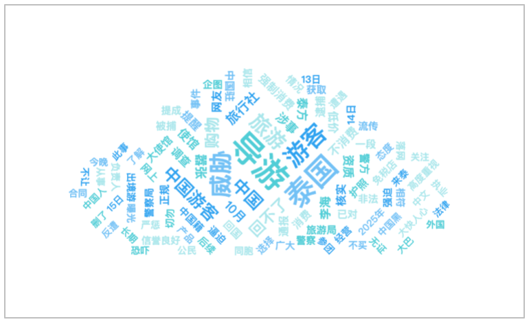 该时段内,有关“泰国一中国籍黑导游威胁游客”的话题提及频次较高的词语有“导游”、“泰国”、“游客”、“威胁”、“旅游”等。