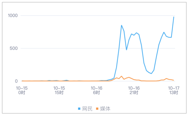 该时段内,境内有关“四川网友拍到孩子赤裸爬行形似野人”的舆情信息,媒体报道于10月16日16时达到最高峰,网民舆情于10月17日13时达到最高峰。