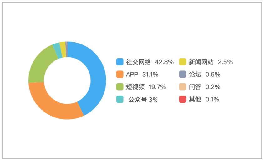 该时段内,境内有关“南昌大学秋招现露骨女主播招聘海报”的舆情主要集中在社交网络平台,相关舆情量约占总量的42.8%,其次为新闻APP约占31.1%,短视频约占19.7%。