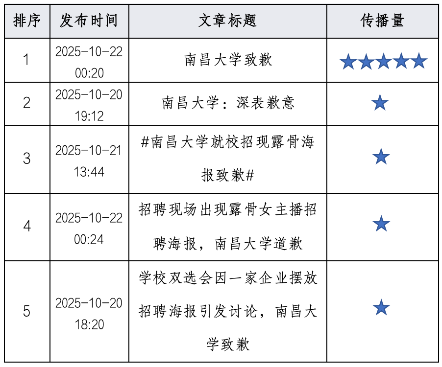 (一)关注校方回应与事件处理  据封面新闻、中国妇女报、环球网报道,南昌大学就招聘会现露骨海报事件发布致歉声明,承认涉事企业资质符合校招要求,但未报备海报内容,现场巡查存在疏漏。校方已要求涉事企业撤场并带走物料,后续将加强资质审核和巡查工作。事件反映出校方在校园招聘管理中的流程不完善,引发对高校就业服务规范性的讨论。
