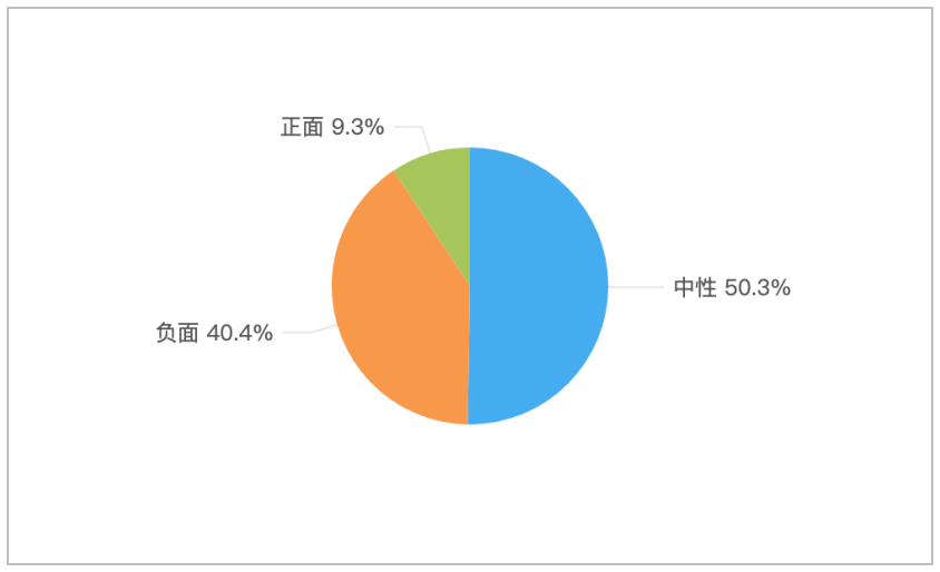 该时段内,关于“歌手郑智化怒斥深圳机场没人性”的舆情情感倾向中,中性舆情占比最多,为50.3%;其次是负面舆情,占比40.4%;正面舆情占比较少,仅为9.3%。