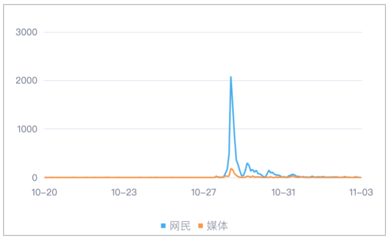 该时段内,境内有关“山姆一门店黄金大闸蟹涉嫌侵权”的舆情信息,媒体舆情于10月28日14时达到最高峰,网民舆情于10月28日14时达到最高峰。