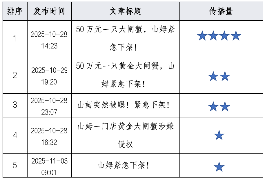 2025年10月20日00时至2025年11月03日15时,境内有关“山姆一门店黄金大闸蟹涉嫌侵权”的舆情信息总体情感倾向以负面为主。舆情在10月28日达到最高峰。