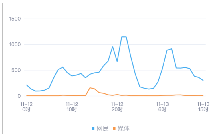 该时段内,境内有关“重庆一河流污染严重”的舆情信息,媒体舆情于11月12日14时达到最高峰,网民舆情于11月12日21时达到最高峰。