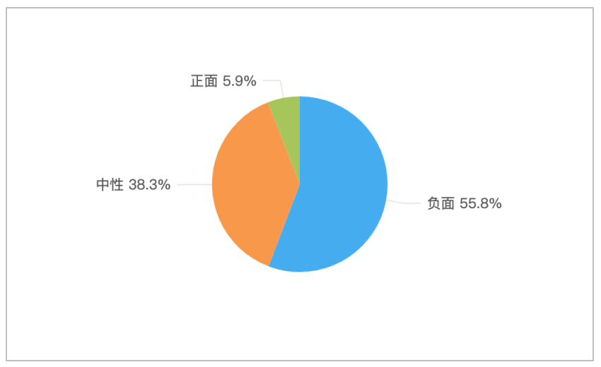 该时段内,境内有关“江苏科技大学博导被指履历造假”的舆情情感倾向中,负面舆情占比最多,达到55.8%,;中性舆情次之,占比38.3%;正面舆情较少,仅占5.9%。