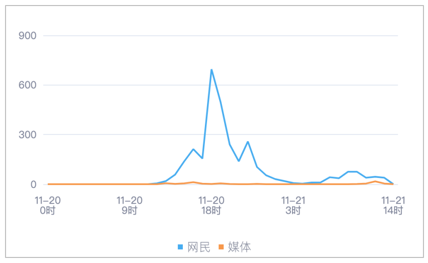该时段内,境内有关“东莞一公园40余只流浪猫被剜眼”的舆情信息,媒体舆情于11月21日12时达到最高峰,网民舆情于11月20日18时达到最高峰。