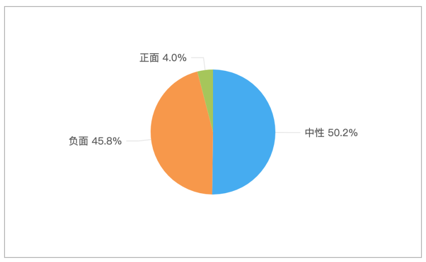 该时段内,境内有关“东莞一公园40余只流浪猫被剜眼”的舆情情感倾向中,中性舆情占比最多,达到50.2%;负面舆情次之,占比45.8%;正面舆情较少,占比仅4.0%。
