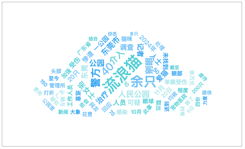 该时段内,有关“东莞一公园40余只流浪猫被剜眼”的话题提及频次较高的词语有“流浪猫”、“余只”、“40”、“警方”、“介入”等。
