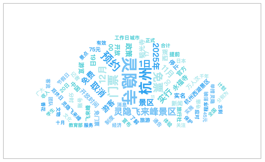 该时段内,有关“杭州灵隐飞来峰景区实施免票政策”的话题提及频次较高的词语有“灵隐寺”、“杭州”、“门票”、“预约”、“免票”等。