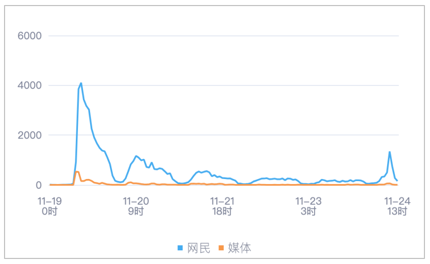 该时段内,境内有关“杭州灵隐飞来峰景区实施免票政策”的舆情信息,媒体舆情于11月19日10时达到最高峰,网民舆情于11月19日12时达到最高峰。