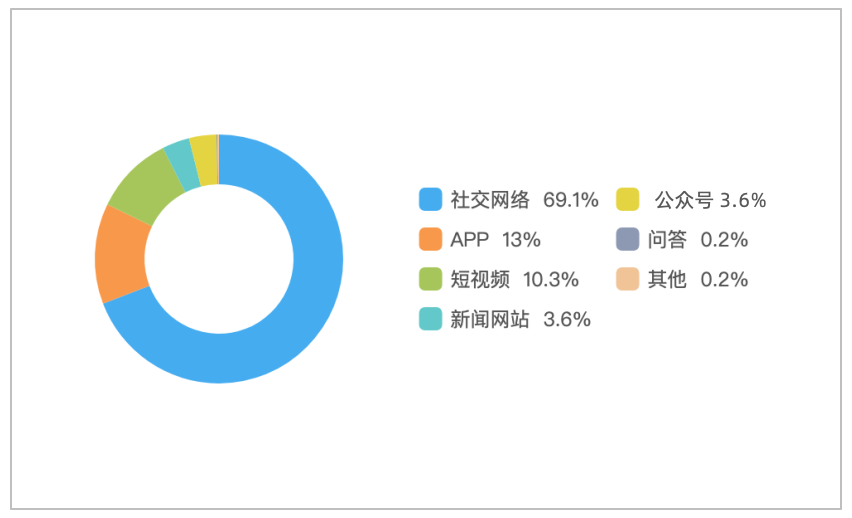 该时段内,境内有关“彝族老人在凉山公益列车上遭围拍”的舆情主要集中在社交网络平台,相关舆情量约占总量的69.1%,其次为新闻APP约占13.0%,短视频约占10.3%。