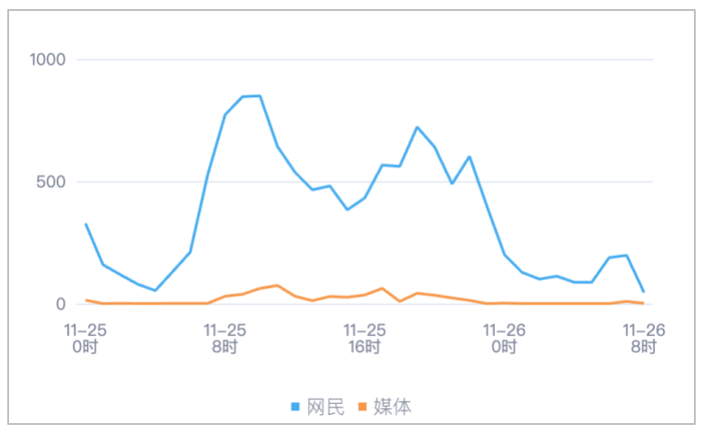 该时段内,境内有关“武汉一酒店前台滞留救命药致房客死亡”的舆情信息,媒体舆情于11月25日11时达到最高峰,网民舆情于11月25日10时达到最高峰。