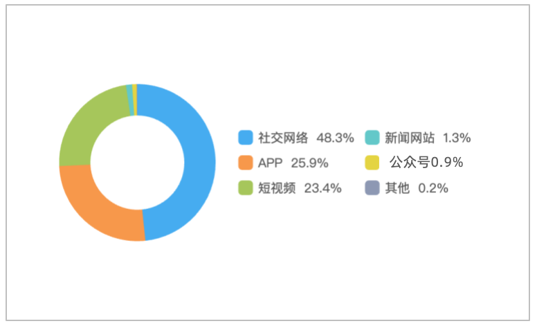 该时段内,境内有关“武汉一酒店前台滞留救命药致房客死亡”的舆情主要集中在社交网络平台,相关舆情量约占总量的48.3%,其次为新闻APP约占25.9%,短视频约占23.4%。