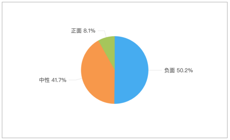该时段内,境内有关“武汉一酒店前台滞留救命药致房客死亡”的舆情情感倾向中,负面舆情占比最多,达50.2%;中性舆情次之,占41.7%;正面舆情较少,仅占8.1%。