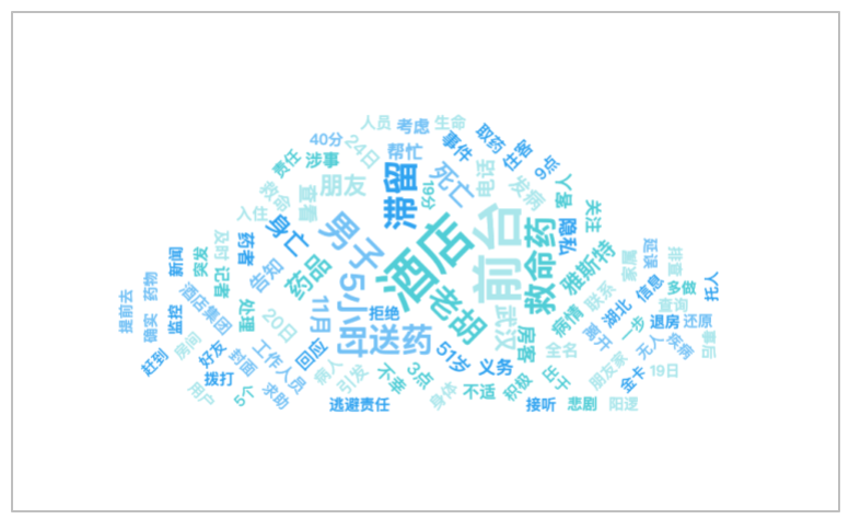 该时段内,有关“武汉一酒店前台滞留救命药致房客死亡”的话题提及频次较高的词语有“酒店”、“前台”、“男子”、“滞留”、“救命药”等。