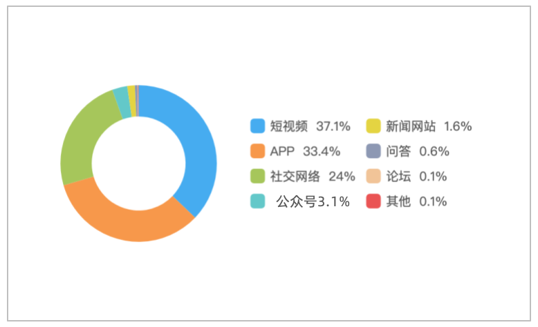 该时段内,境内有关“湖南一对情侣婚前先后坠楼身亡”的舆情主要集中在短视频平台,相关舆情量占总量的37.1%,其次为新闻APP约占33.4%,社交网络约占24.0%。