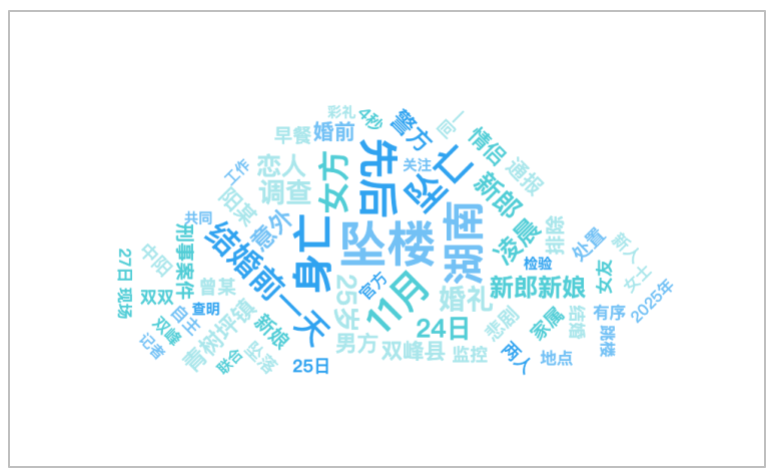 (五)呈现事发经过与时间线梳理据【封面新闻】、【新闻晨报】、【新浪热点】报道,多家媒体对事件的发生过程进行了详细梳理,构建了相对完整的时间线。报道称,11月23日晚,准新人与朋友聚餐后返回女方家中。24日清晨,新郎首先被发现坠亡。随后,约7时40分,新娘被母亲叫醒下楼,目睹男友遗体后,返回四楼跳下,最终于当日下午经抢救无效身亡。其中,凌晨5时04分的短暂视频通话成为连接两个悲剧时刻的关键节点。酒店方面也证实,原定25日的婚礼已在24日取消。这一观点集群侧重于客观陈述已知的、经过多方信息交叉验证的事件经过,为公众理解事件全貌提供了基础框架。