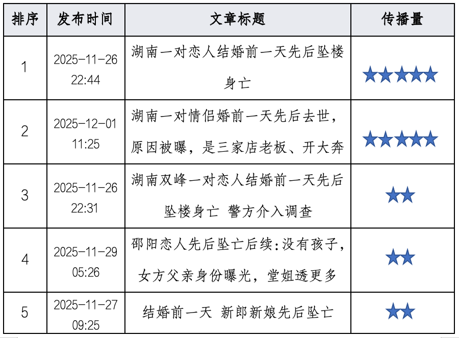 (一)关注官方调查结论与事件定性据【检察日报】、【法治日报】、【环球时报】报道,官方联合调查组已发布通报,明确事件性质为意外与非刑事案件。通报指出,2025年11月24日凌晨,新郎曾某某在青树坪镇一自建房意外坠楼身亡,随后,新娘阳某于同一地点自主坠落身亡。公安机关通过现场勘查、调阅监控、调查走访和法医检验等多方面工作,最终查明并排除了刑事案件的可能性。这些权威媒体均重点传达了官方呼吁,希望公众尊重法律事实和逝者亲属,不传播未经证实的谣言,以维护健康有序的网络环境。此观点集群的核心在于强调事件的调查已经结束,并给出了官方的权威结论,旨在平息公众猜测,引导舆论回归理性。