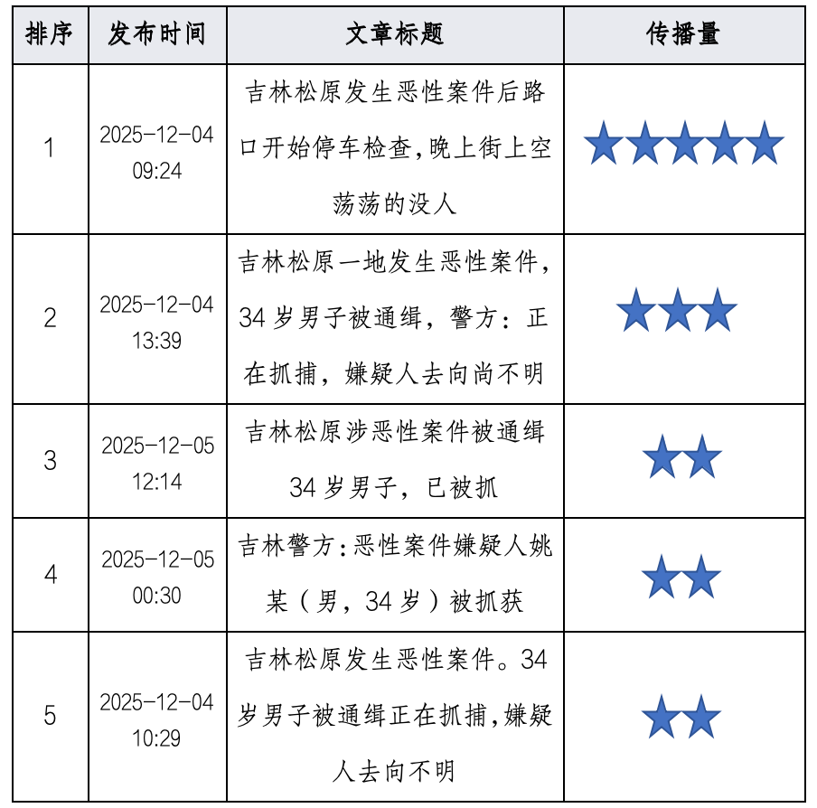 (五)关注官方通报的权威发布与案件定性据【法治日报】、【中国新闻网】、【新浪热点】报道,长岭县公安局于12月4日通过官方渠道发布了案件情况通报,正式确认了两起命案均系姚某所为,并宣布其已被安全抓获。媒体报道均引用了官方通报原文,强调了信息的权威性和准确性,并对案件进行了“恶性案件”、“刑事案件”等定性描述。此集群观点凸显了官方通报在舆论场中的核心地位,媒体通过转引官方定调,起到了稳定公众情绪、传递权威信息的作用。