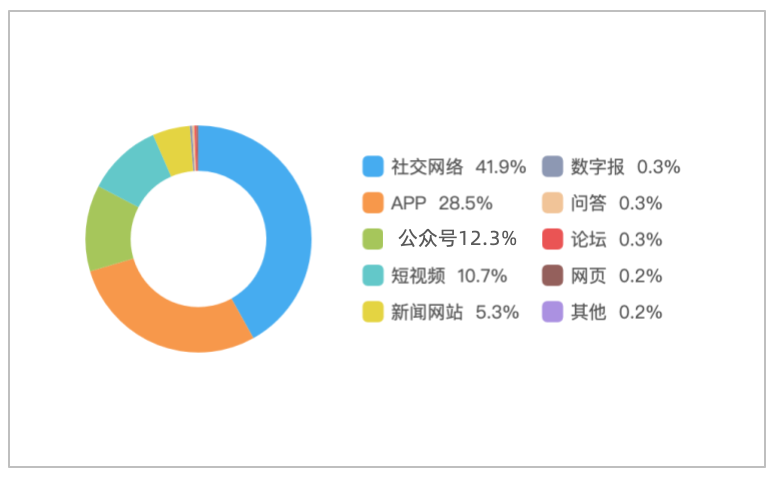 该时段内,境内有关“大湾区大学正式成立”的舆情主要集中在社交网络平台,相关舆情量占总量的41.9%,其次为新闻APP占28.5%,微信占12.3%。