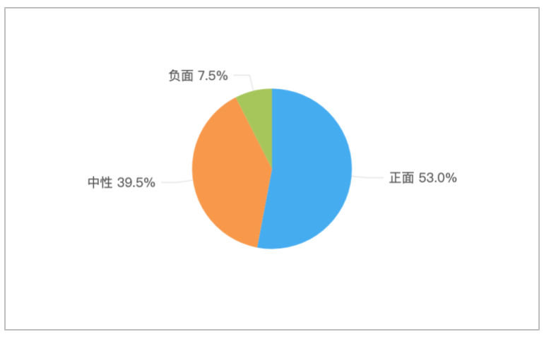 该时段内,境内有关“大湾区大学正式成立”的舆情情感倾向中,正面舆情占比最多,达 53.0%;其次是中性舆情,占 39.5%;负面舆情占比较少,仅为 7.5%。