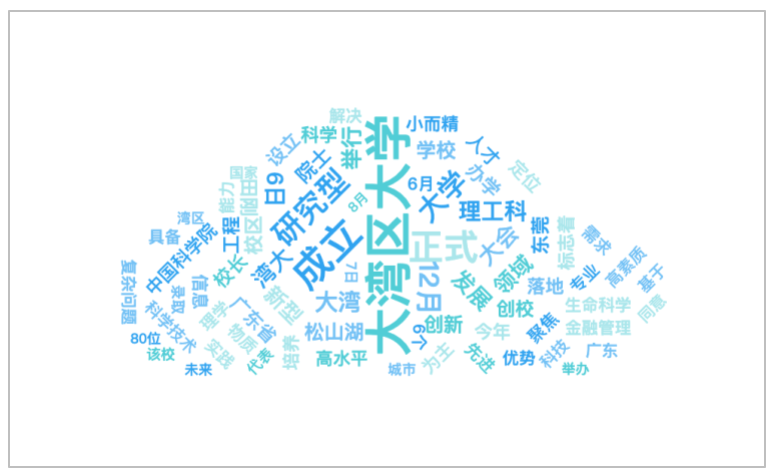 该时段内,有关“大湾区大学正式成立”的话题提及频次较高的词语有“大湾区大学”、“成立”、“正式”、“研究型”、“大学”等。