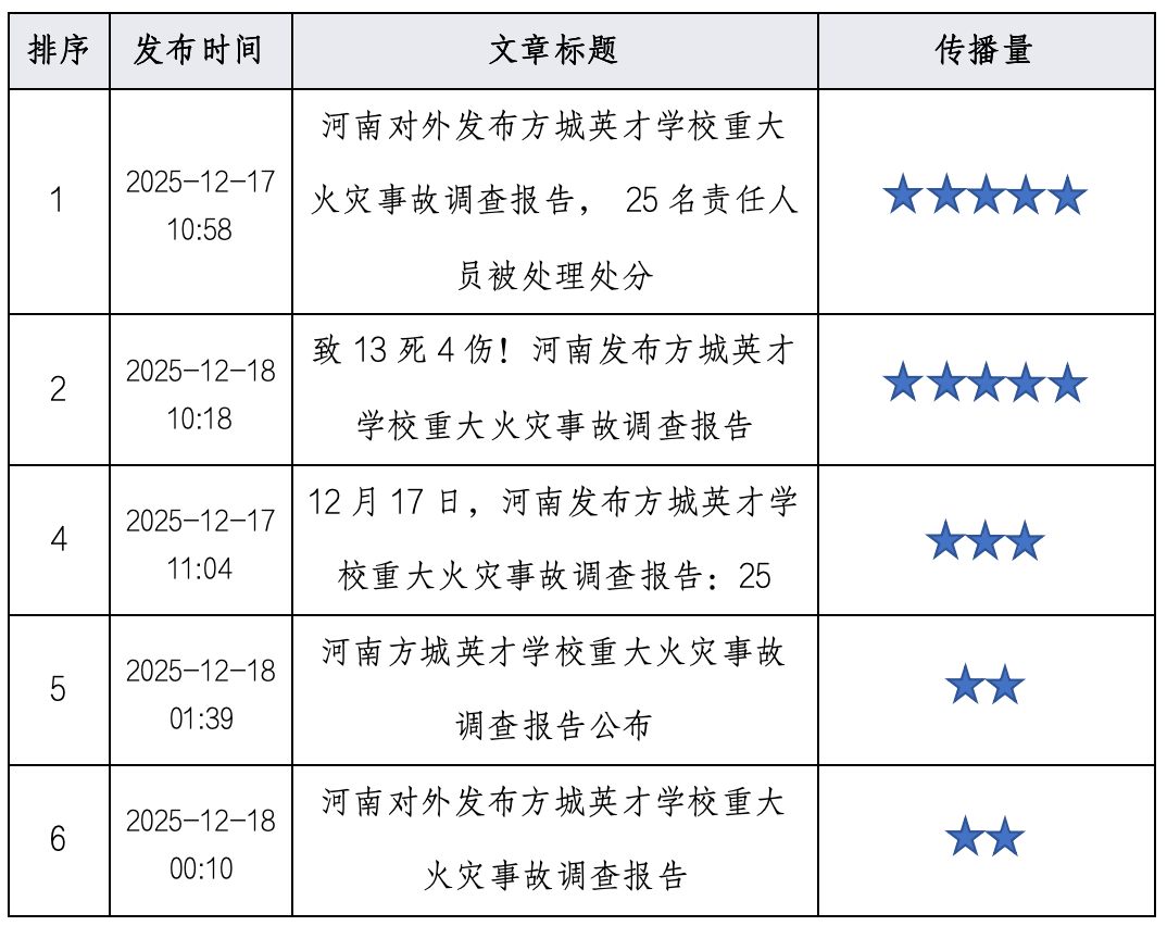 (一)关注事故调查结果与责任认定据【新华社】、【广州日报】、【观察者网】报道,河南省于12月17日正式发布了方城县英才学校“1·19”重大火灾事故的调查报告。报告经深入调查认定,事故的直接原因是起火宿舍内一名小学生使用打火机,引燃了宿舍内的衣物、床铺等可燃物,导致火势迅速蔓延。调查组通过现场勘验、询问、鉴定、视频分析及模拟实验等多种方式查明了原因。同时,报告明确了事故性质,并认定有25名责任人员因履行职责不力、监督管理不到位而受到纪检监察机关的严肃处理处分。此外,公安机关已对5人采取刑事强制措施,涉事学校法定代表人、校长等3人因涉嫌教育设施重大安全事故罪将被提起公诉。这部分报道核心在于官方调查结论的权威发布与司法追责进程的披露。