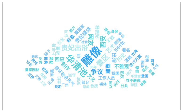 该时段内,有关“西安华清池贵妃出浴雕像被指不雅”的话题提及频次较高的词语有“雕像”、“华清池”、“景区”、“贵妃出浴”、“西安”等。